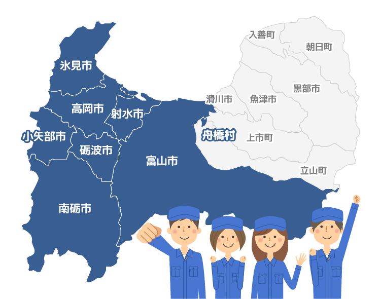 - 富山市、高岡市、氷見市、砺波市、小矢部市、射水市、船橋村