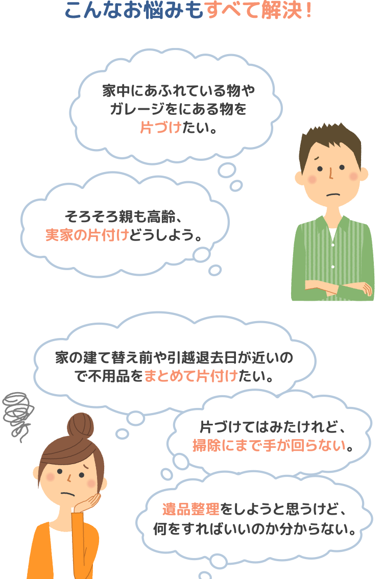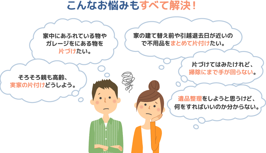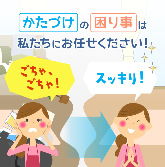 ”かたづけの困り事”は、ご家庭や企業によって異なります。出来るだけコストを抑えたい、徹底的に整理・クリーニングを進めたい等、ご相談に応じた提案をいたします。